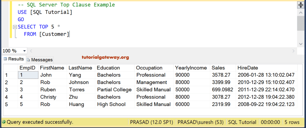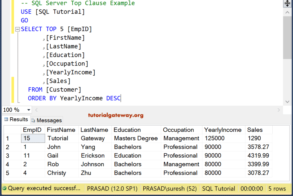 下面的示例将返回年收入最高的客户的前 5 行。当我们使用 WITH TIES 后跟 TOP 子句时,它将返回前 5 条记录。此外,所有年收入等于 SELECT 语句最后一条记录(第 5 条)的记录。