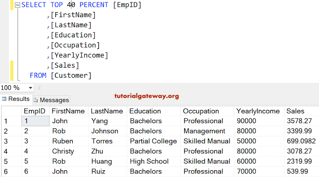 在表中,数据默认不会按任何顺序插入。因此,如果您想检索年收入最高的三个客户,您必须使用 ORDER BY 语句对数据进行排序。接下来,您必须使用此 Top 子句获取前三个客户。