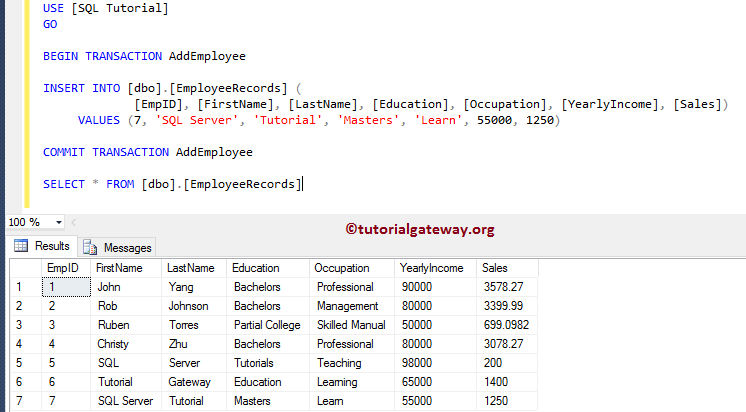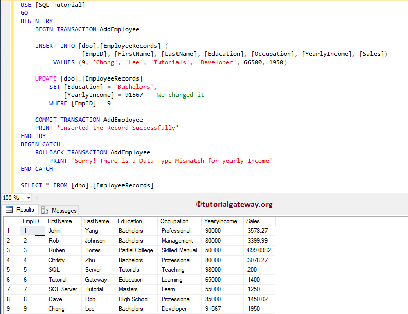 BEGIN TRY BEGIN TRANSACTION AddEmployee INSERT INTO [dbo].[EmployeeRecords] ( [EmpID], [FirstName], [LastName], [Education], [Occupation], [YearlyIncome], [Sales]) VALUES (9, 'Chong', 'Lee', 'Tutorials', 'Developer', 66500, 1950) UPDATE [dbo].[EmployeeRecords] SET [Education] = 'Bachelors', [YearlyIncome] = 91567 -- We changed it WHERE [EmpID] = 9 COMMIT TRANSACTION AddEmployee PRINT 'Inserted the Record Successfully' END TRY BEGIN CATCH ROLLBACK TRANSACTION AddEmployee PRINT 'Sorry! There is a Data Type Mismatch for yearly Income' END CATCH SELECT * FROM [dbo].[EmployeeRecords]