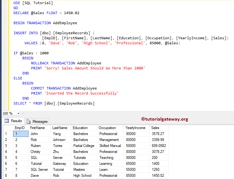 BEGIN TRY BEGIN TRANSACTION AddEmployee INSERT INTO [dbo].[EmployeeRecords] ( [EmpID], [FirstName], [LastName], [Education], [Occupation], [YearlyIncome], [Sales]) VALUES (9, 'Chong', 'Lee', 'Tutorials', 'Developer', 66500, 1950) UPDATE [dbo].[EmployeeRecords] SET [Education] = 'Bachelors', [YearlyIncome] = 'Hey You gotme Wrong!' WHERE [EmpID] = 9 COMMIT TRANSACTION AddEmployee PRINT 'Inserted the Record Successfully' END TRY BEGIN CATCH ROLLBACK TRANSACTION AddEmployee PRINT 'Sorry! There is a Data Type Mismatch for yearly Income' END CATCH SELECT * FROM [dbo].[EmployeeRecords]