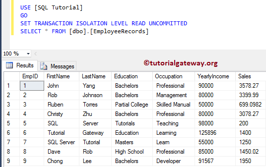 SET TRANSACTION ISOLATION LEVEL READ UNCOMMITTED SELECT * FROM [dbo].[EmployeeRecords]
