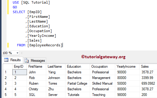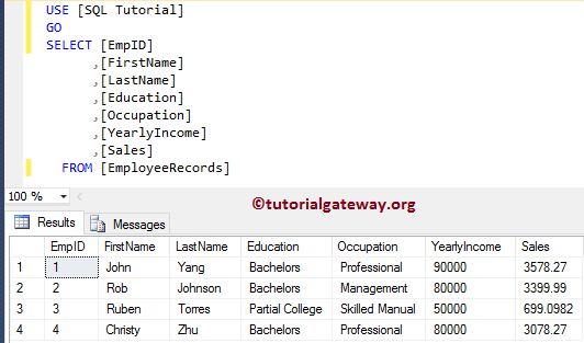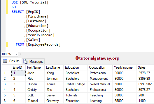 [EmpID], [FirstName], [LastName], [Education], [Occupation], [YearlyIncome], [Sales])