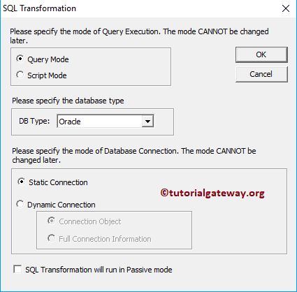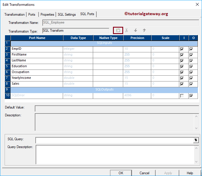 单击“创建”按钮将弹出一个名为 Informatica SQL Transformation 的新窗口。