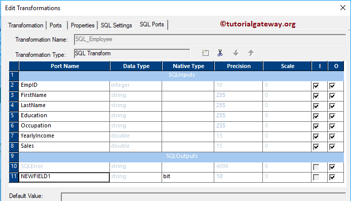 在 Informatica 映射编辑器中双击 SQL 转换以编辑或配置转换。在“端口”选项卡下,您可以看到从源定义输入自动生成的输出端口。