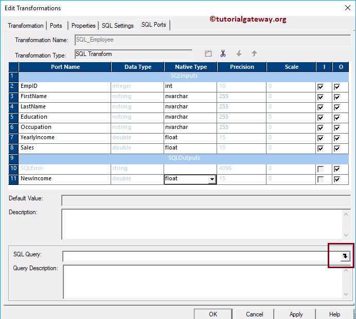 端口:这是此转换中最关键的选项卡。我们将在其中编写查询或选择脚本。在开始编写脚本之前,我将添加一个额外的字段,因为我们的目标表有一个 New Income 列。为此,请单击“新建字段”按钮。