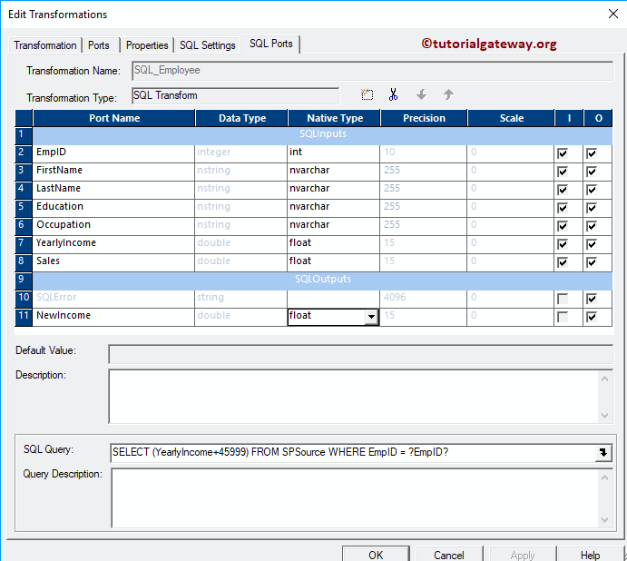 它会打开一个带有可用参数的编辑器。如您所见,我们使用 Select Statement 从 SP Source 表中选择年收入,并为每个员工记录添加 45999。查询是: