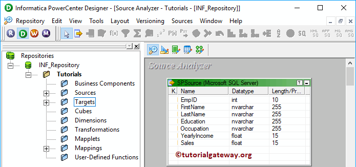 成功连接后,请导航到源分析器并定义您的 Informatica 源。在此示例中,我们将使用数据库中的 Sp Source 表作为我们的源定义。请参考数据库源文章。