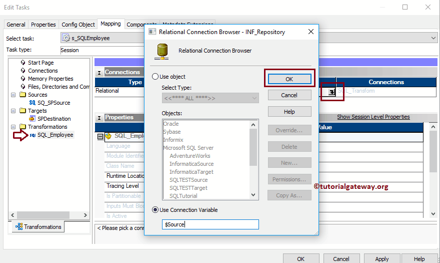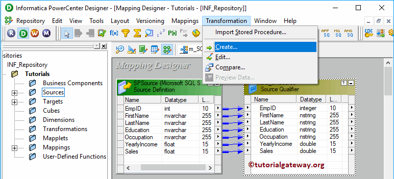 最后,我们需要配置 Informatica SQL 转换。因此,单击“转换”文件夹中存在的 Employee。