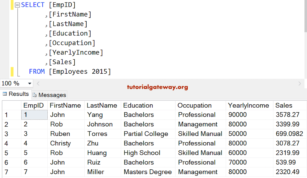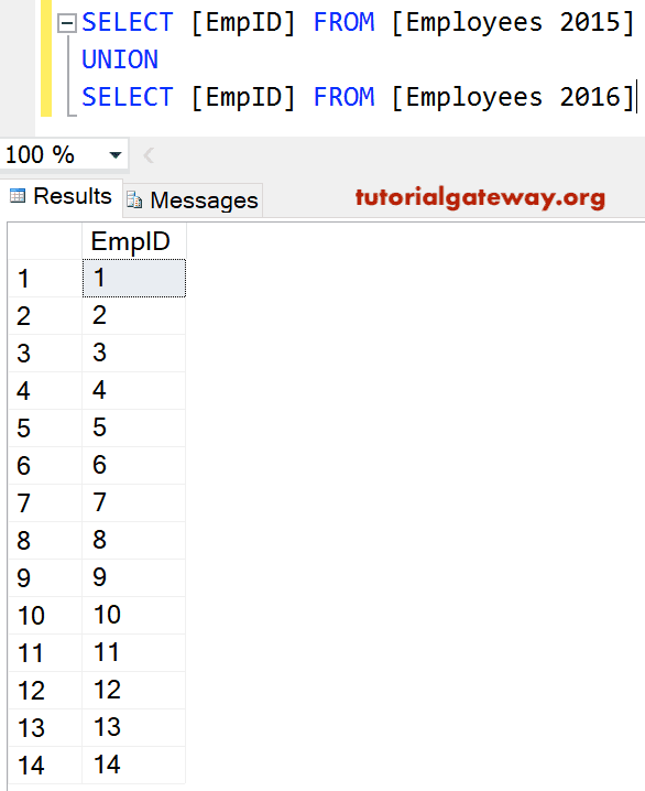 在此示例中,我们使用此操作符合并多个列。例如,以下 [Server](https://tutorialgateway.cn/sql/) 查询合并了 Employees 2015 的结果集和 Employees 2016 的结果集,并显示了结果。
