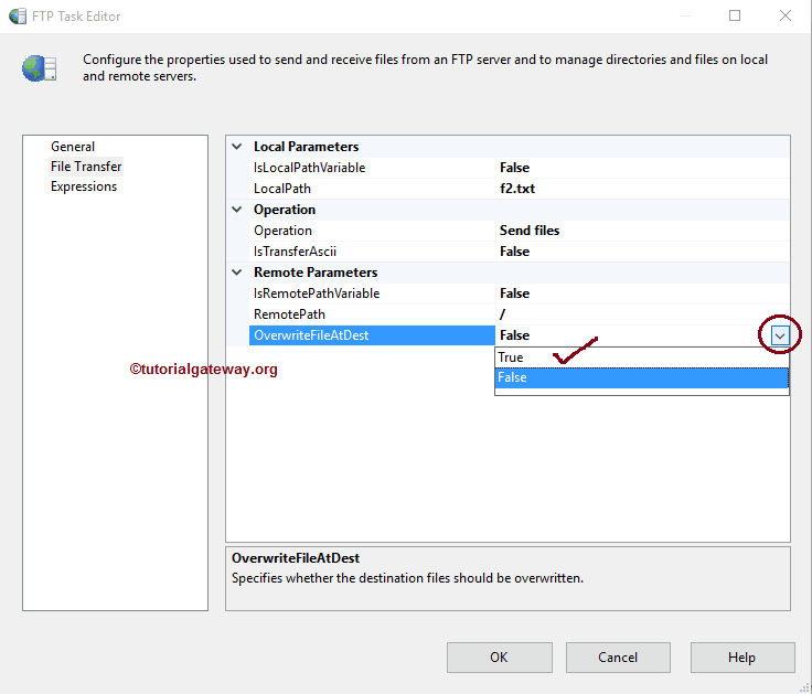 OverwriteDetination:此属性有两个选项:True 和 False。如果将其设置为 true,SSIS FTP 任务将覆盖目标路径中存在的现有文件。