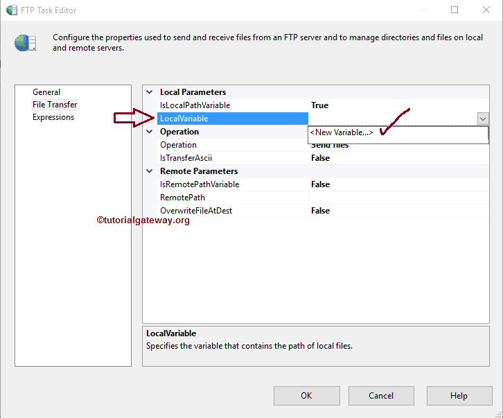 IsRemotePathVariable:此属性有两个选项:True 和 False。如果将其设置为 true,我们必须从变量访问远程路径。如果将其设置为 false,我们必须使用 FTP 连接管理器(我们在常规选项卡中创建的)手动选择远程路径。