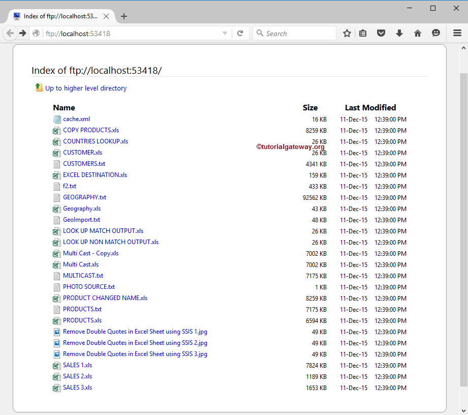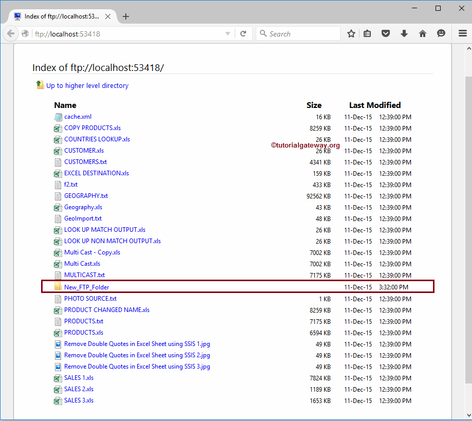 下面的屏幕截图显示了 FTP 服务器内部的数据。我们的任务是在 SSIS FTP 服务器根目录中创建一个新文件夹或目录。
