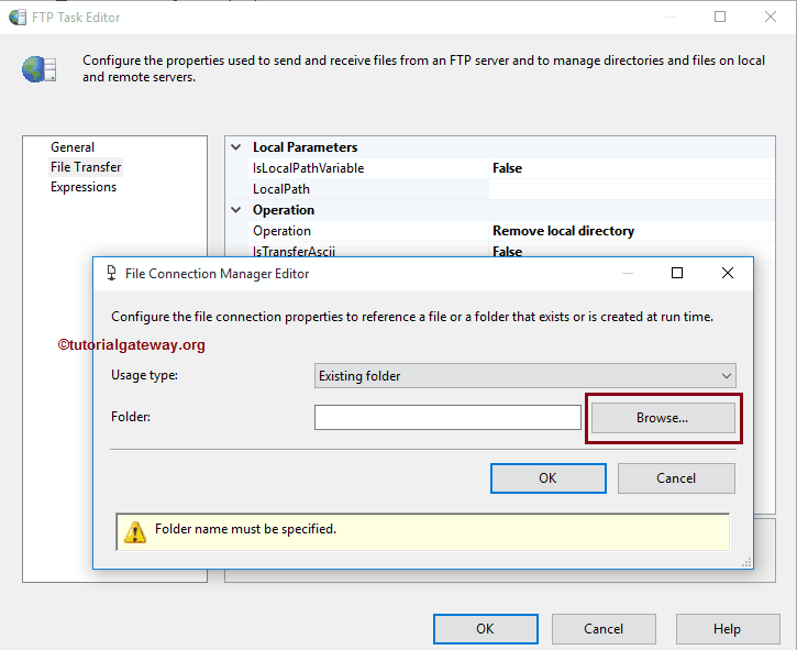 该 SSIS FTP 任务 用于对文件和文件夹(或目录)执行各种操作。在本文中,我们将向您展示配置 SSIS FTP 任务以删除本地目录的步骤,并附有示例。