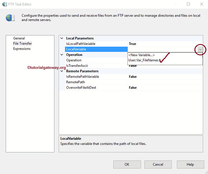 接下来,我们必须将文件名存储在变量中,以便在我们的FTP 任务中使用它们。为此,请转到“变量映射”部分,选择用户变量(如果有),或创建一个新变量。