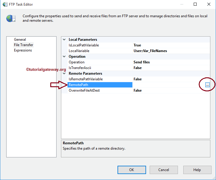 在“连接”部分,我们有一个名为 FTPConnection 的属性。单击下拉箭头将显示已创建的 FTP 连接(如果有),或者请单击“<新建连接…>”选项创建一个。在此示例中,我们使用已创建的连接(FTP 连接管理器)。有关连接设置,请参阅FTP 连接管理器文章。