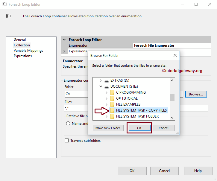 接下来,单击“浏览”按钮从我们的文件系统中选择文件夹名称。从下面的屏幕截图可以看到,我们在 E 驱动器中选择了“文件系统任务 - 复制文件”文件夹。单击“确定”按钮进行选择。