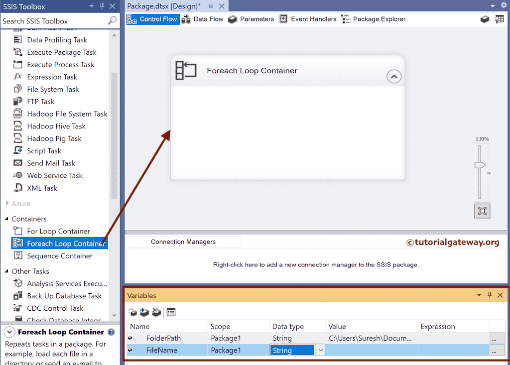 将 Foreach 循环容器拖放到控制流区域。接下来,我们创建了两个字符串类型变量 FolderPath 和 FileName,用于存储文件夹路径和文件名。