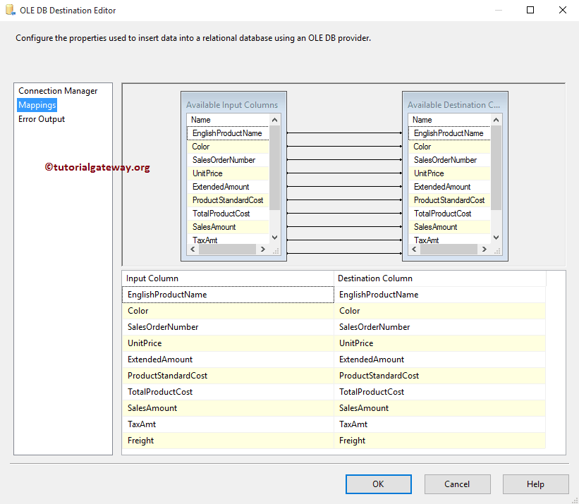 步骤 6:单击“映射”选项卡。接下来,检查源列是否与 SSIS OLE DB 目标列准确映射。