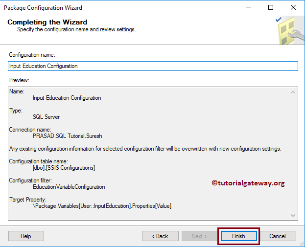 我将此 SSIS 包配置(使用 SQL Server)重命名为“输入教育配置”。然后单击“完成”按钮关闭向导。