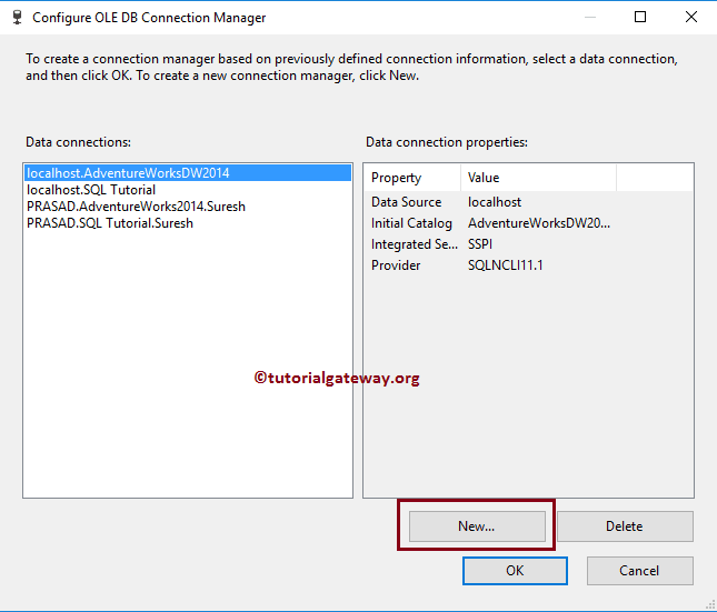 单击“新建”按钮将打开“配置 OLE DB 连接管理器”。请访问OLE DB 连接管理器文章。