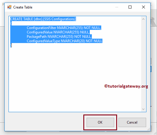 CREATE TABLE [dbo].[SSIS Configurations] ( ConfigurationFilter NVARCHAR(255) NOT NULL, ConfiguredValue NVARCHAR(255) NULL, PackagePath NVARCHAR(255) NOT NULL, ConfiguredValueType NVARCHAR(20) NOT NULL )