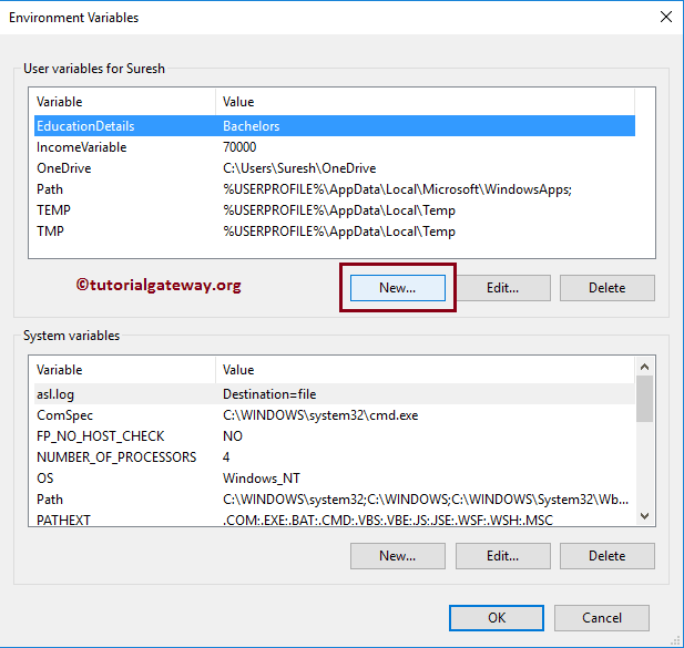 单击“环境变量...”按钮后,将打开如下所示的窗口。在这里,您可以看到所有现有变量及其值。请单击“新建…”按钮以添加新变量。