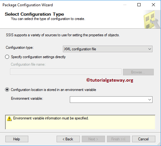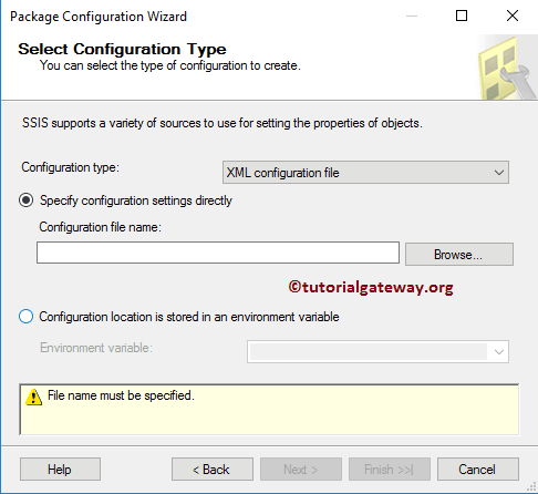 选择配置类型:在这里,我们必须选择配置类型。默认情况下,SSIS 会选择 XML 配置文件,因此您无需执行任何操作。