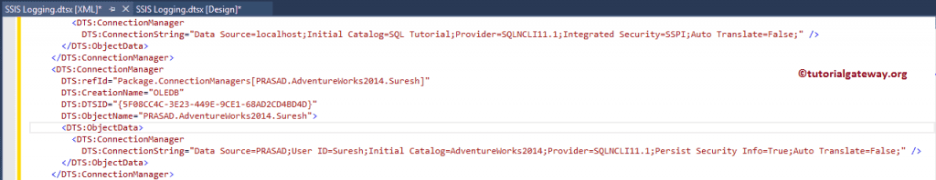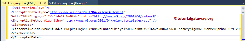 如果您将 SSIS 包保护级别更改为 EncryptAllWithPassword 并提供了密码,则 XML 文件将显示如下图像。它不会向用户显示任何信息。所有内容都已加密。
