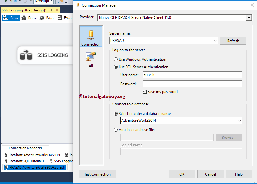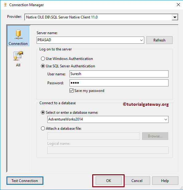 单击“新建”按钮将打开“连接管理器”窗口。从下面的屏幕截图可以看出,我们正在使用 PRASAD 作为实例,并为 SQL 身份验证提供了用户名和密码。我们选择了 [AdventureWorks2014] 作为数据库名称。