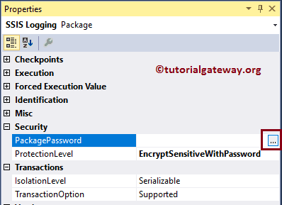 我将 SSIS 包保护级别更改为 EncryptSensitiveWithPassword。如果您选择此选项,则必须提供密码来加密敏感数据。要分配密码,请单击“包密码”旁边的“...”按钮。