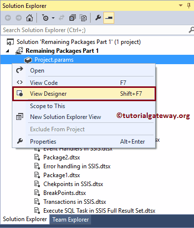 右键单击Project.params,然后从上下文菜单中选择“查看设计器”选项以创建SSIS项目参数。
