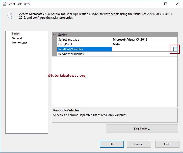 双击脚本任务将打开以下编辑器来配置脚本任务组件。我们在上一篇文章中已经解释了脚本任务的配置步骤,请参考相同的。