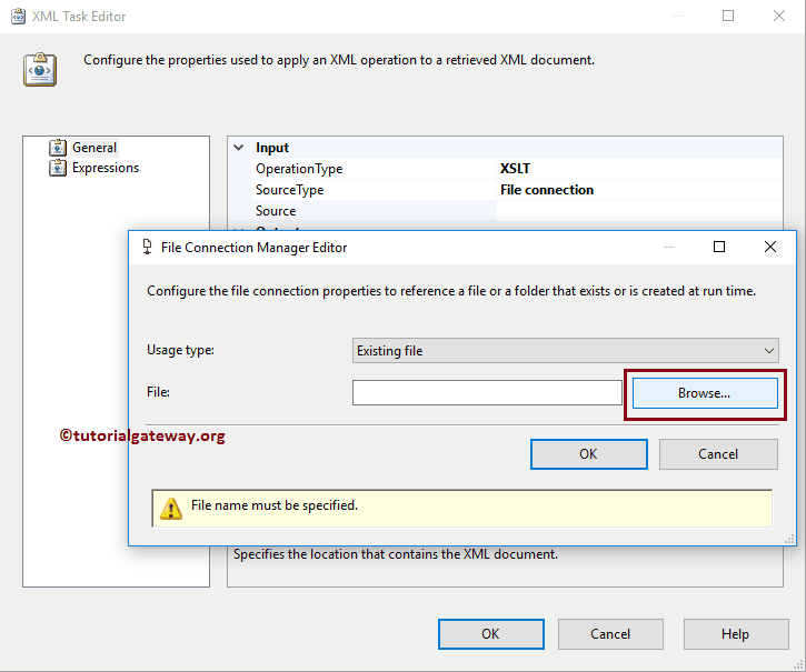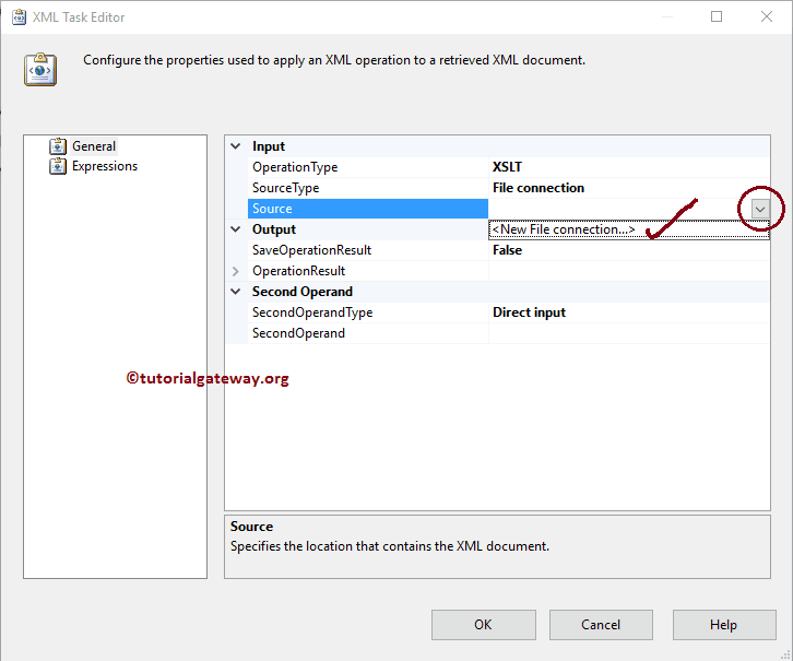 让我们通过选择 SourceType 属性来配置 SSIS XML 任务的源连接,以使用 XSLT 转换 XML 文件。