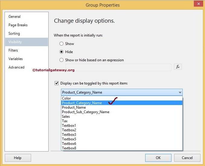 - 隐藏:当您最初运行报表时,如果您想隐藏产品类别,请选择“隐藏”选项。在此示例中,我们希望最初隐藏产品类别名称,因此我们选择了此选项。