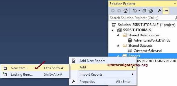 这将打开“添加新项”窗口,其中包含所有可用选项。请选择“报表”选项并根据您的需求重命名它。在此表格报表示例中,我们将它重命名为 NEW SSRS REPORT.rdl。