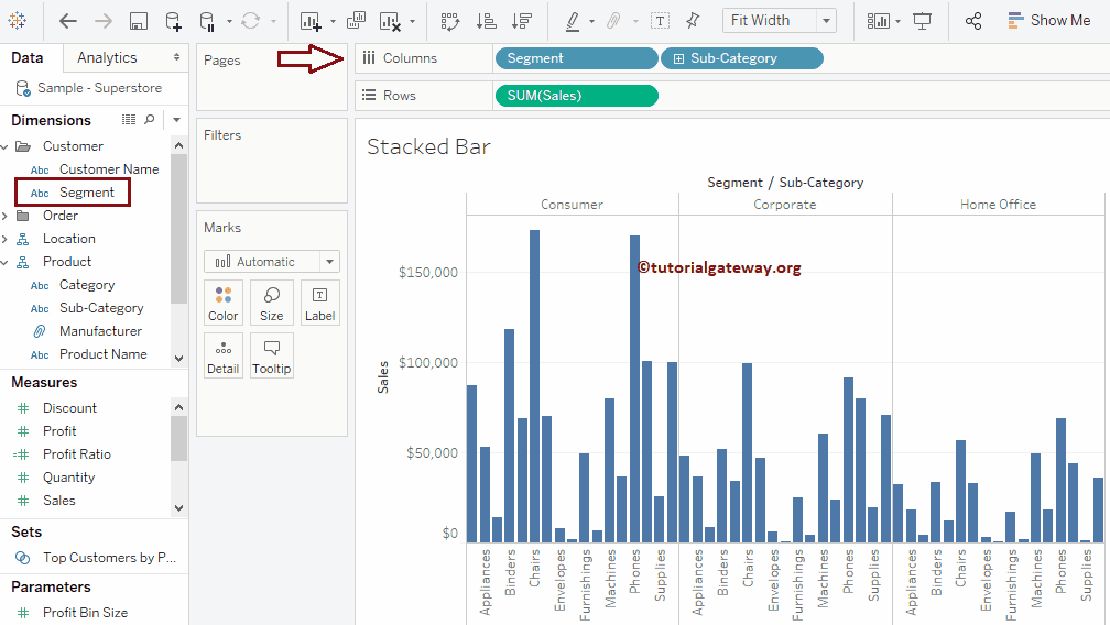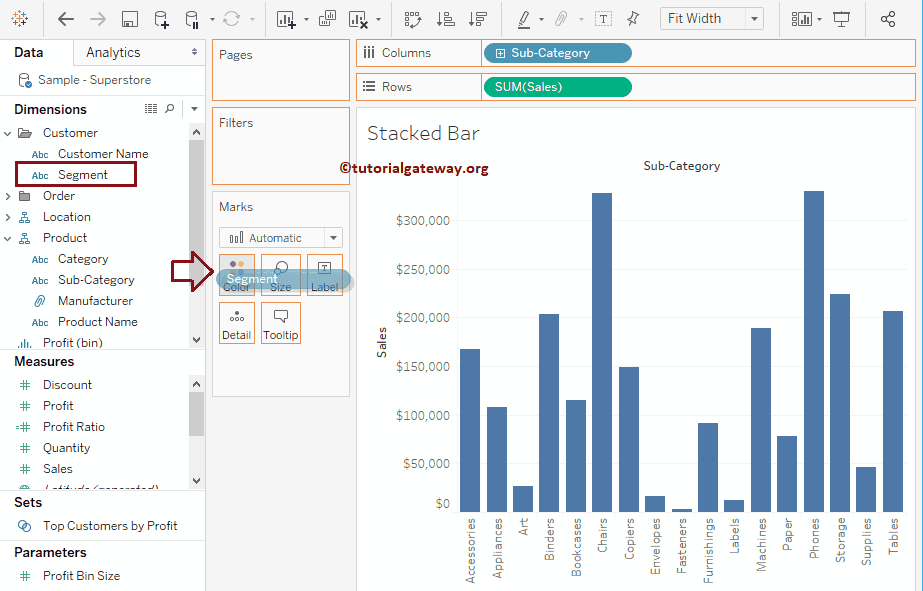 接下来,将“Sub-category”(子类别)从“Dimension”(维度)区域拖放到“Column”(列)功能区。一旦您拖放它们,就会生成一个合适的条形图,如下所示。在此示例中,我们希望按“Segments”(细分市场)堆积条形图。因此,我们将 Segments 从 Dimension 区域拖到 Marks Card 中的 Color(颜色)功能区。