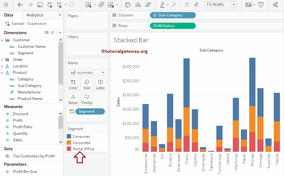将 Segment 字段拖放到 Colors 功能区后,您将看到堆积条形图。