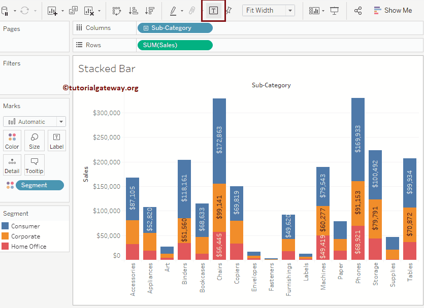 要向 Tableau 堆积条形图添加数据标签,请单击工具栏中的 Show Mark Labels(显示标记标签)按钮。