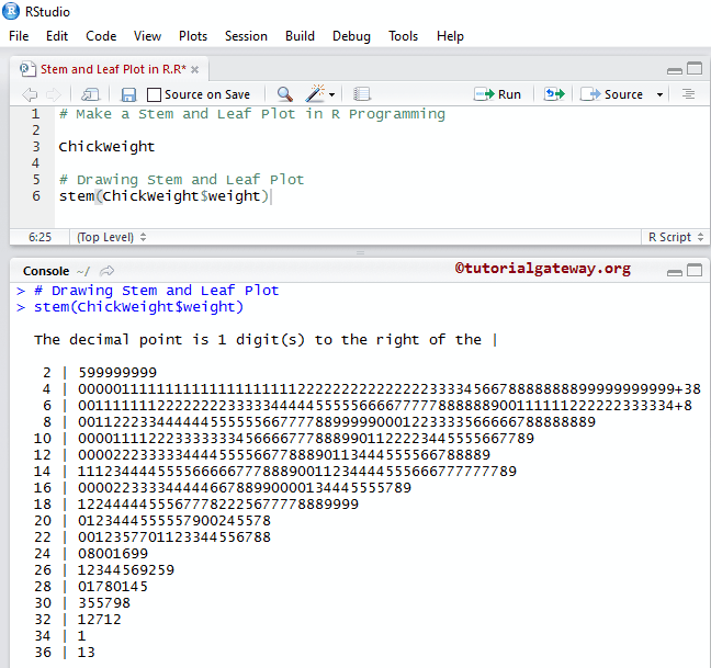 在本例中,我们将展示如何使用RStudio提供的ChickWeight数据集来制作茎叶图。如果您需要从外部文件导入数据,我建议您参考R Read CSV文章,以了解如何在R编程中导入CSV文件。