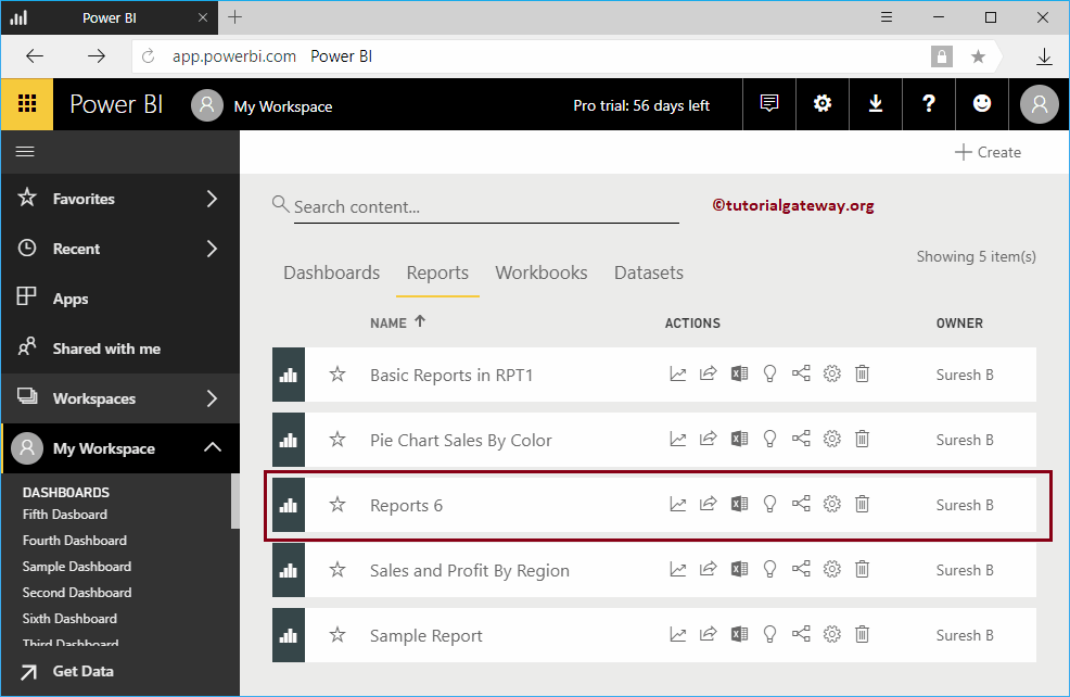 请点击“我的工作区”并选择“报表”选项卡查看它们。从下面的截图可以看出,有五个报表。在此报表示例中,我们订阅了报表 6。让我点击报表 6 来查看其中的页面。