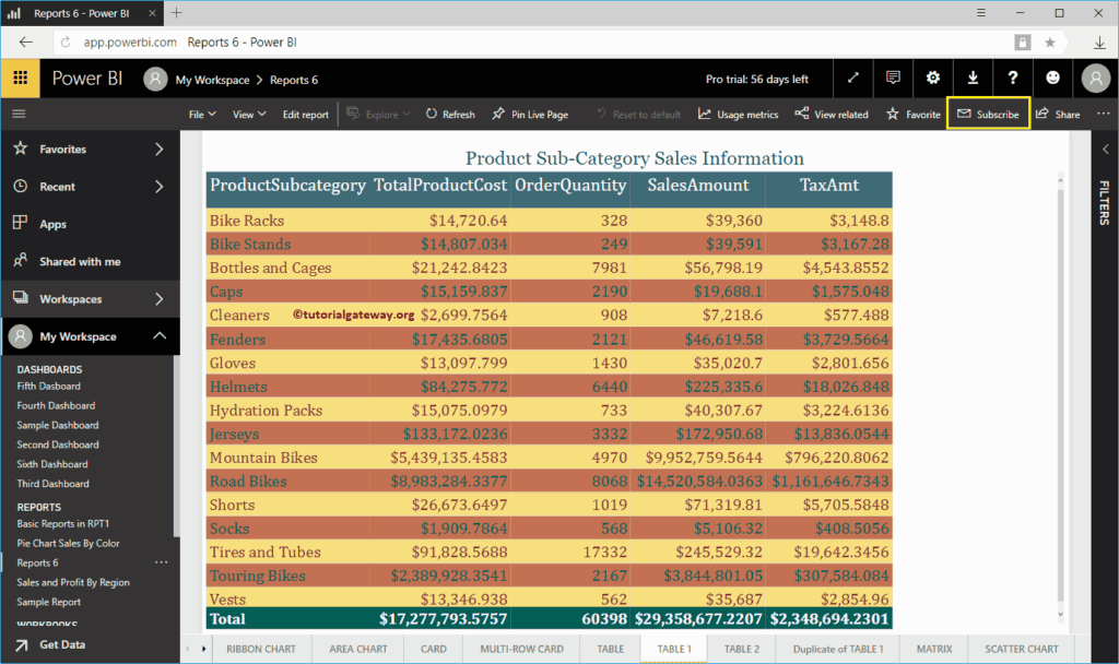 从下面的截图中,您可以看到此报表中有很多页面。在此示例中,我们从“表 1”开始订阅。为了订阅报表(实际上是页面),请点击右上角的“订阅”按钮,如下图所示。
