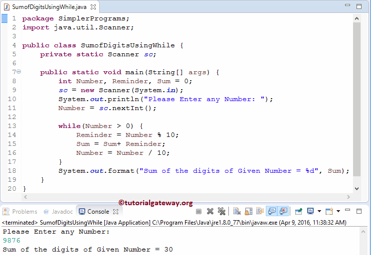 从上面的 Java 数字各位之和屏幕截图中,用户输入的值为:Number= 9876。