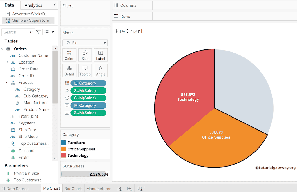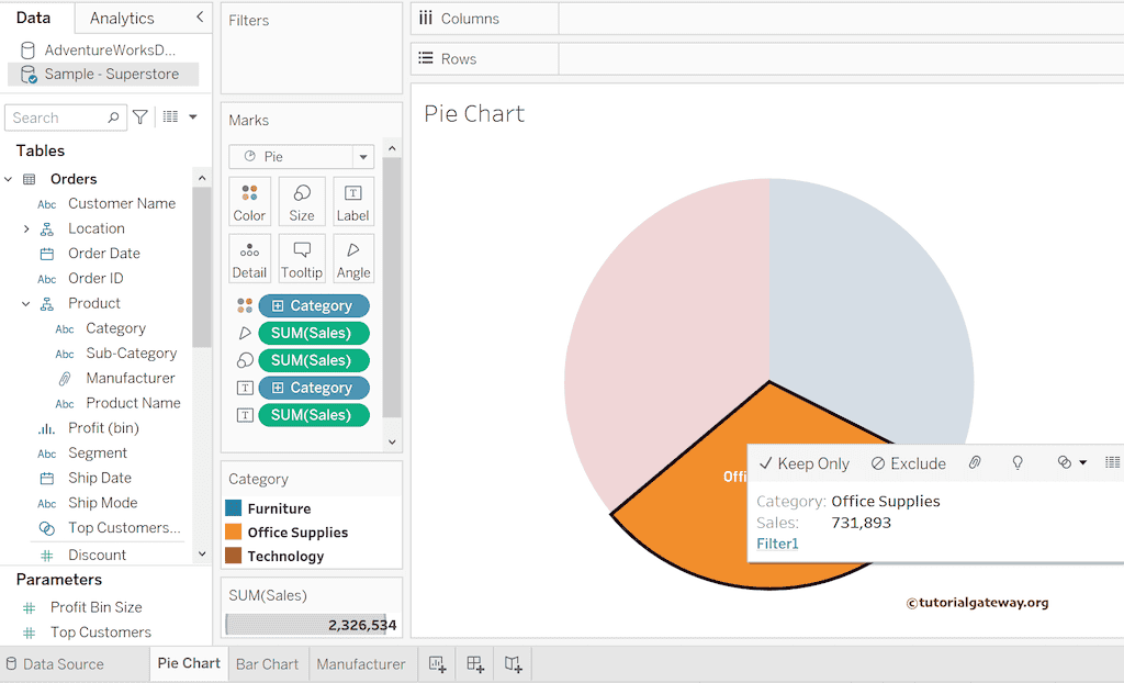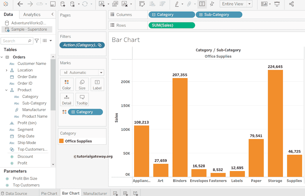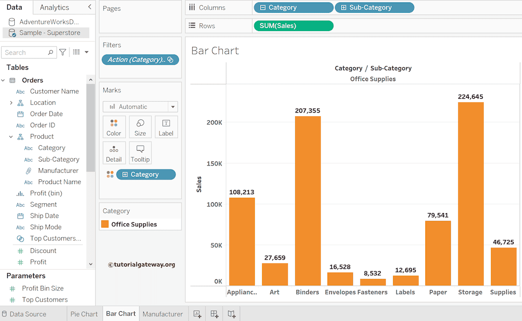 我们将使用一个饼图和一个并排条形图来演示 Tableau 操作过滤器。对于这些图表,我们使用了“Sample Superstore”Excel 文件。请访问“Excel 源”文章,了解“数据源”。