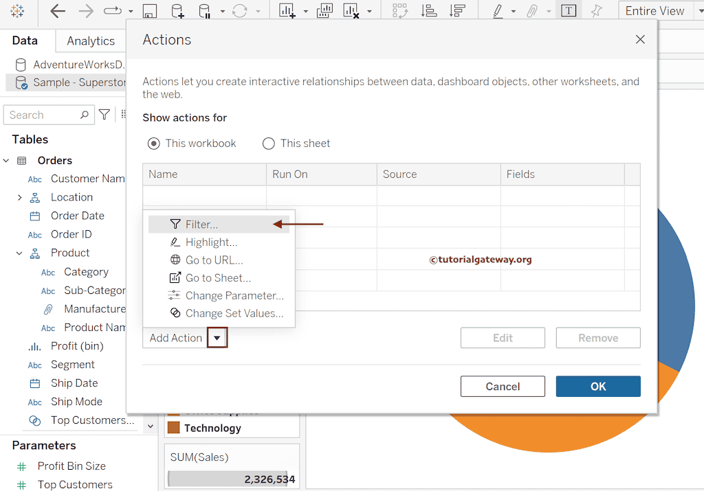 单击“插入”选项旁边的向下箭头,从下拉列表中选择可用的维度或度量作为操作过滤器的名称。目前,我将保留默认名称“Filter1”。