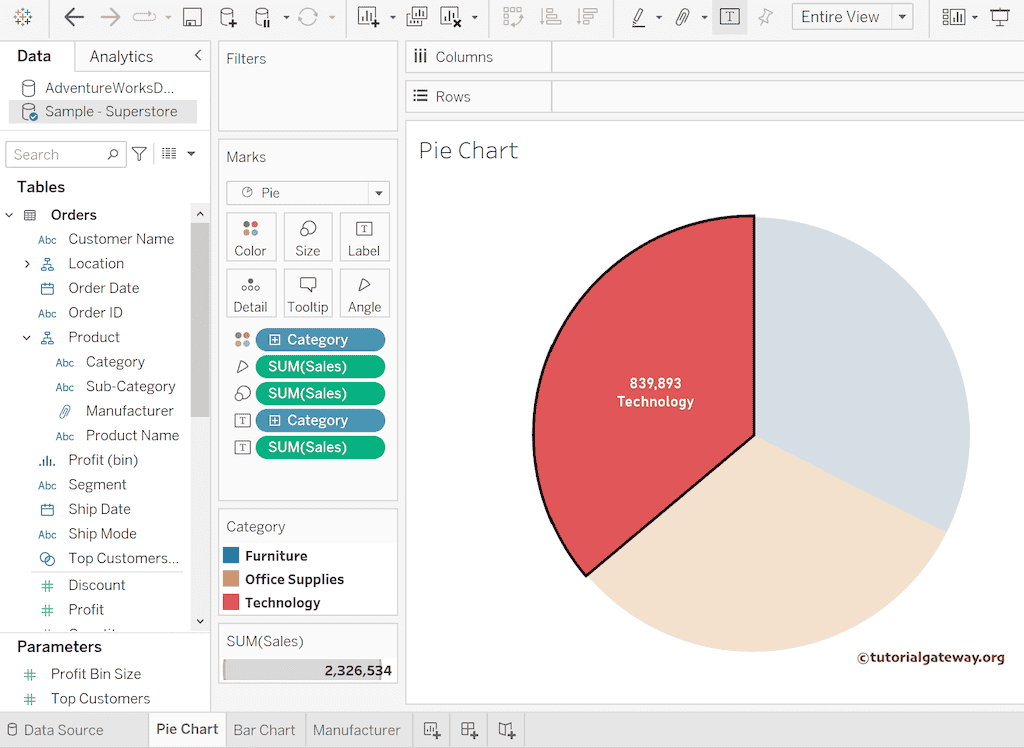 要创建饼图,请将“标记类型”从“自动”更改为“饼图”,将“类别”维度添加到“颜色”,并将“销售额”度量添加到“大小”和“角度”架。将“销售额”和“类别”字段添加到“标签”架以显示数据标签。我们将此饼图作为 Tableau 操作过滤器的源工作表。
