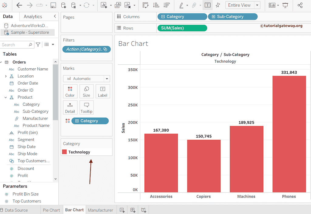 它将自动跳转到条形图工作表,并显示属于“技术”的子类别。您可以注意到“筛选器”架上新出现的字段,该字段充当操作过滤器。请使用 Control 键或鼠标选择多个切片;它将仅显示属于这些切片的子类别。