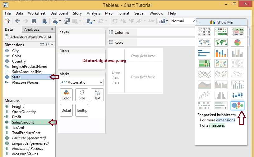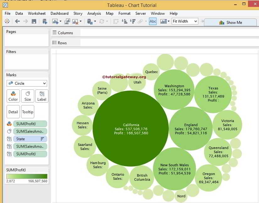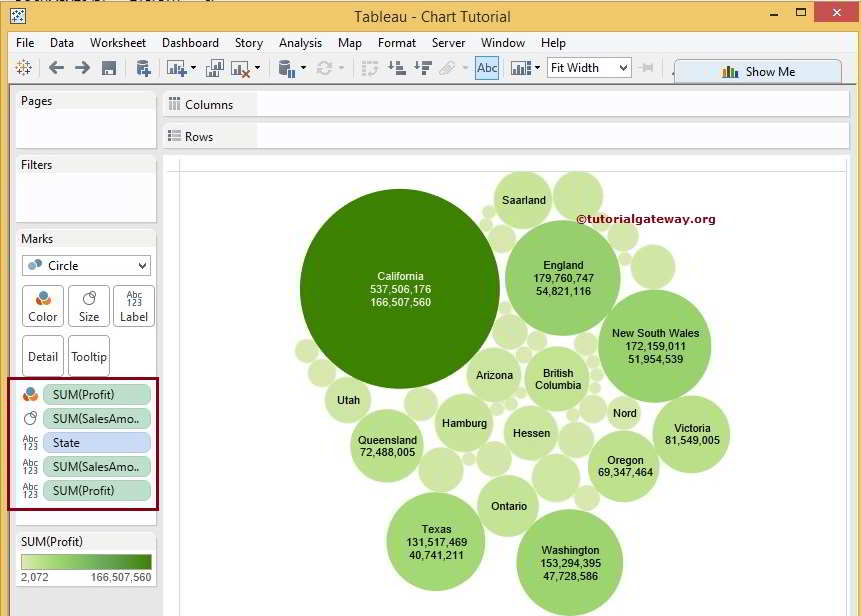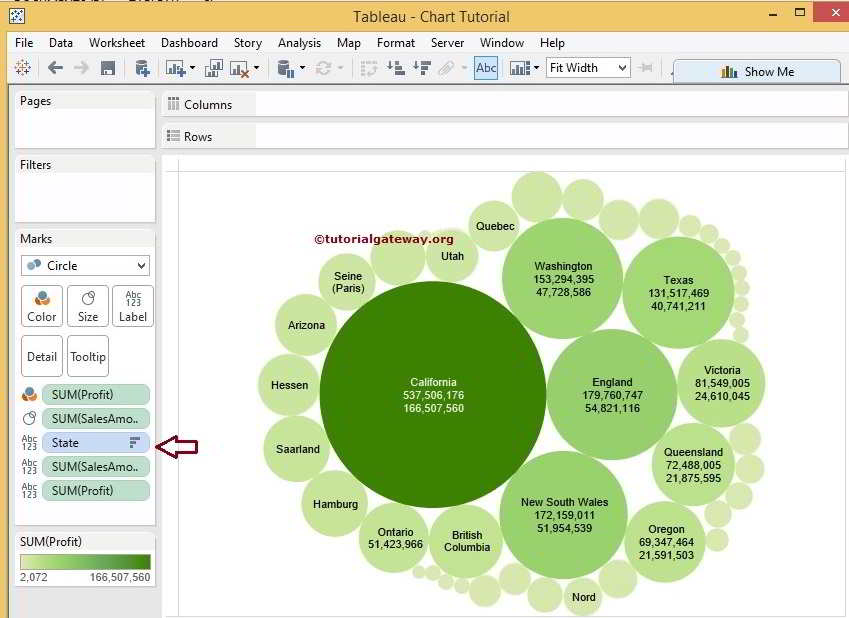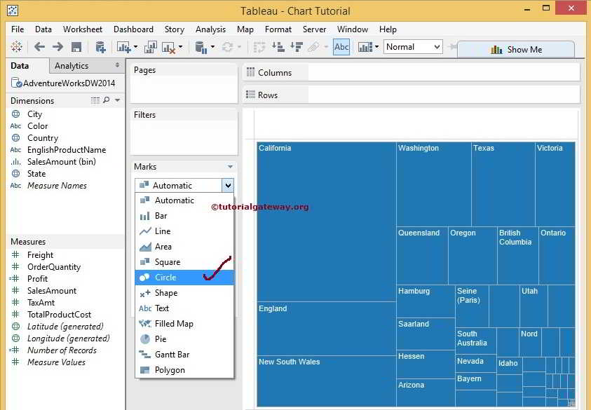 接下来,将“销售额”从度量区域拖放到“大小”字段。默认情况下,桌面会显示一个树状图。从下面的 Tableau 屏幕截图中,您可以看到树状图报告中可用的州名。有关更多图表 >> 单击此处。