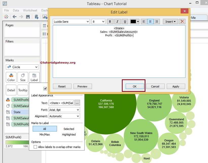 让我们也将“销售额”添加到“文本”字段。通过这样做,我们可以看到州名和销售额。要执行此操作,请将“销售额”从度量区域拖到“标记”架中存在的“文本”字段。