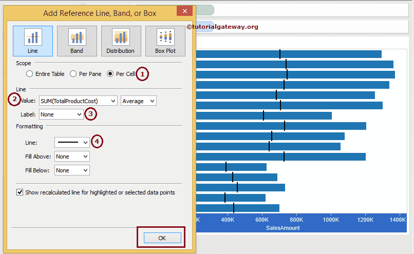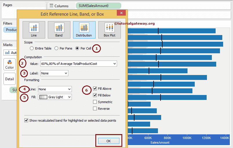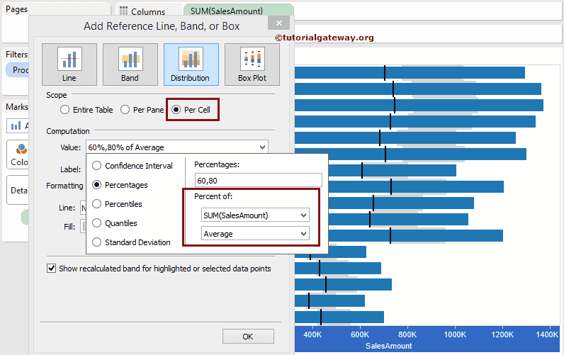 选择该选项后,将打开一个名为“添加参考线、带或盒”的新窗口。默认情况下,范围将是“每个窗格”,因此请将其更改为“每个单元格”,并将值从“销售金额”更改为“产品总成本”。接下来,填充参考线以下的区域。