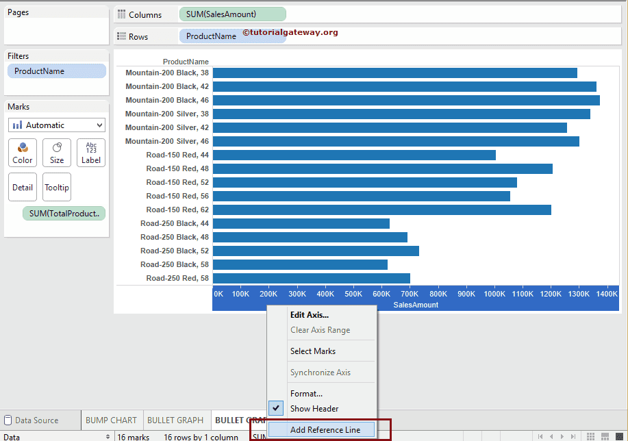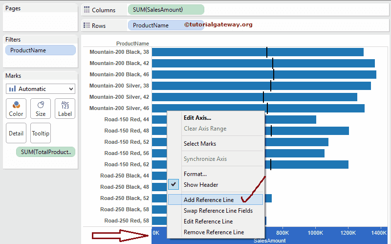 要将此条形图转换为 Tableau 中的迷你图,我们必须添加参考线和分布。为此,右键单击“销售金额”轴,然后选择“参考线”选项。